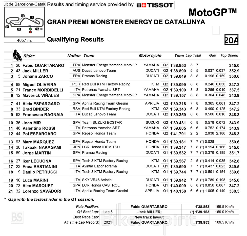 Ο “El Diablo” το πέτυχε με χρόνο 1: 38.853, φέρνοντας το Yamaha M1 του μπροστά από το εργοστασιακό Ducati του Jack Miller, ο οποίος πέρασε από το Q1 και ήταν πρωταγωνιστής μαζί με έναν άλλο Ducatista, τον Johann Zarco, της Team Pramac, που έκλεισε την πρώτη γραμμή εκκίνησης στην 3η θέση.