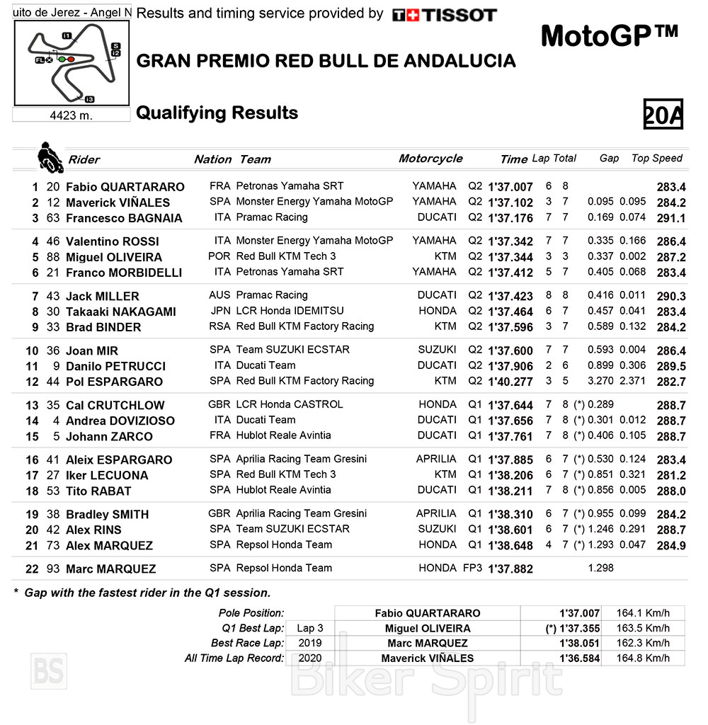 Από την δεύτερη σειρά και την 4η θέση θα ξεκινήσει ο Valentino Rossi που έγραψε 1.37.342 στον τελευταίο γύρο! Από την 5η θέση θα ξεκινήσει ο Miguel Oliveira με το πρώτο ΚΤΜ και την καλύτερη θέση έως τώρα, μπροστά από τον Franco Morbidelli που έκλεισε την πρώτη εξάδα!