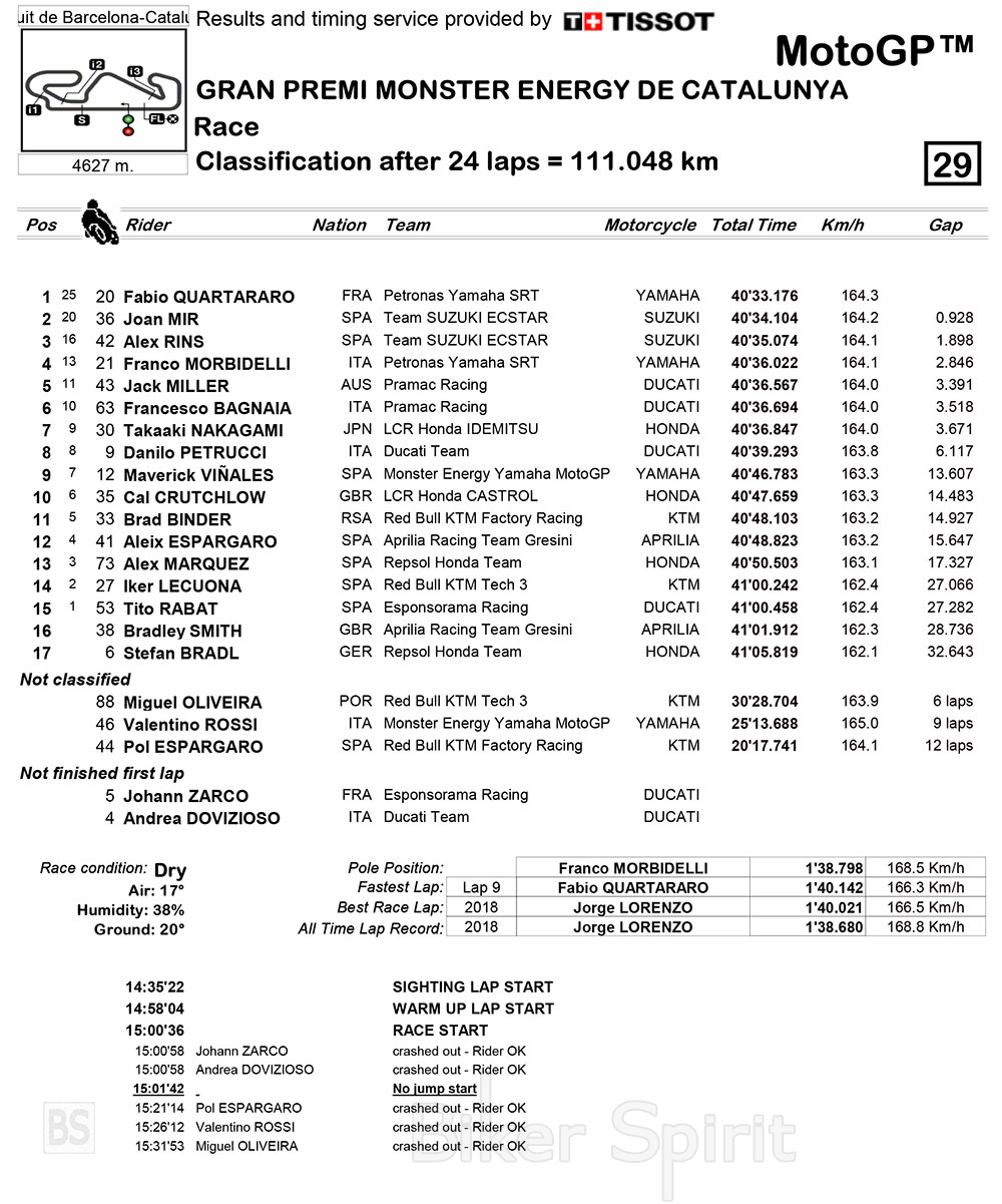 Ο Fabio Quartararo κέρδισε τον αγώνα στην Catalunya και πέρασε και πάλι στην κορυφή της βαθμολογίας, μετα και την πτώση του Dovizioso στην 2η στροφή στον πρώτο γύρο του αγώνα, όταν τον παρέσυρε ο Zarco!