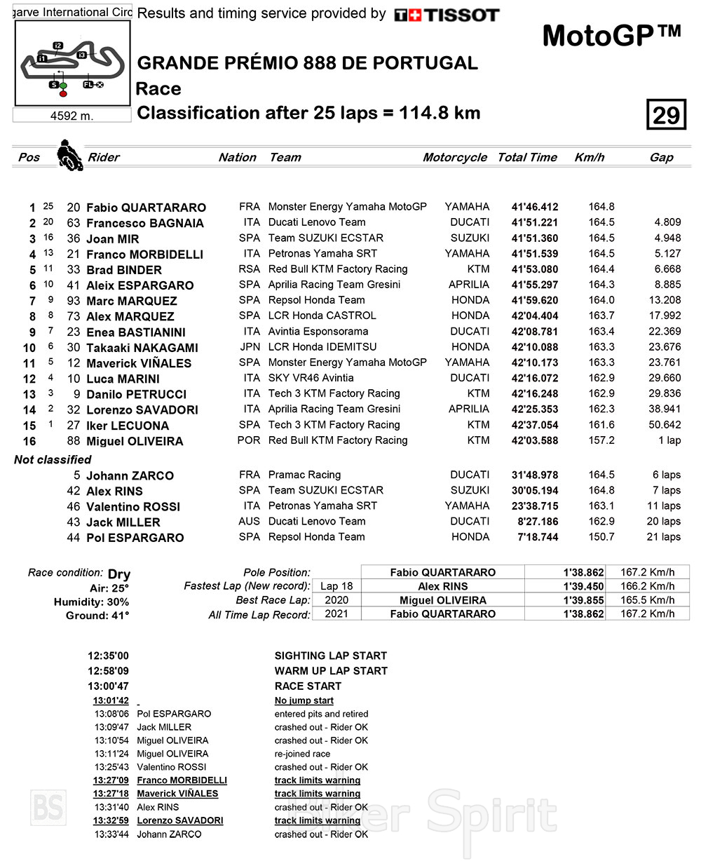 Στην 12η θέση τερμάτισε ο Luca Marini, μπροστά από τον Danilo Petrucci, το δεύτερο Aprilia με τον Savadori και τον Lecuona που συμπλήρωσαν την 15αδα που παίρνει βαθμούς!