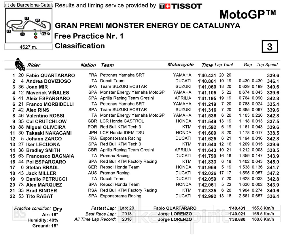 Εξαιρετική δεύτερη θέση για τον Andrea Dovizioso, ο οποίος με το εργοστασιακό Ducati έγραψε χρόνο 0,430s πίσω από τον πρώτο. Ο “Dovi” προηγείται του Joan Mir με 0.199s, όπου είχε πτώση χωρίς συνέπειες.