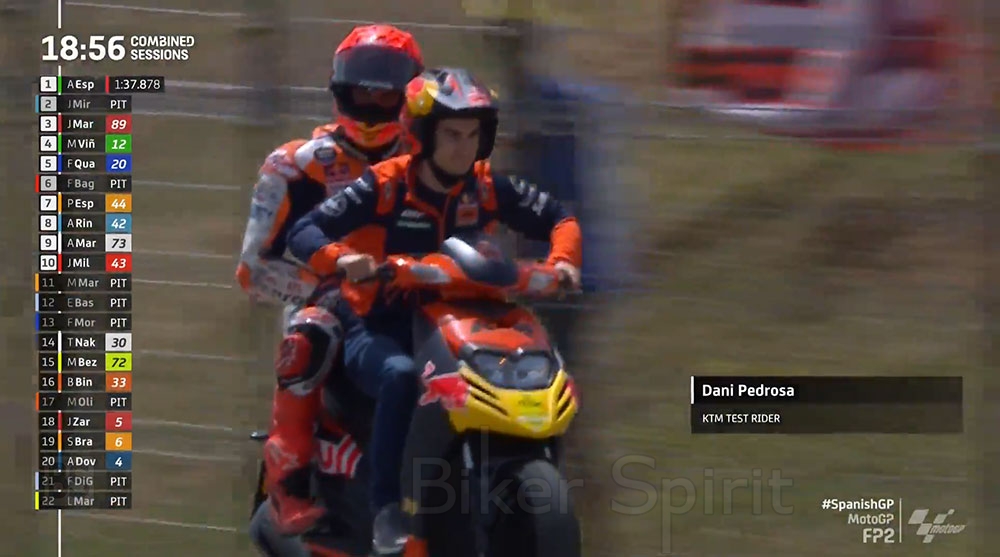 Το στιγμιότυπο της ημέρας ήταν ο Dani Pedroza που είναι οδηγός δοκιμών της ΚΤΜ να μεταφέρει τον Marquez με το σκούτερ του μετα την 2η πτώση του πρώην ομόστυαλού του!