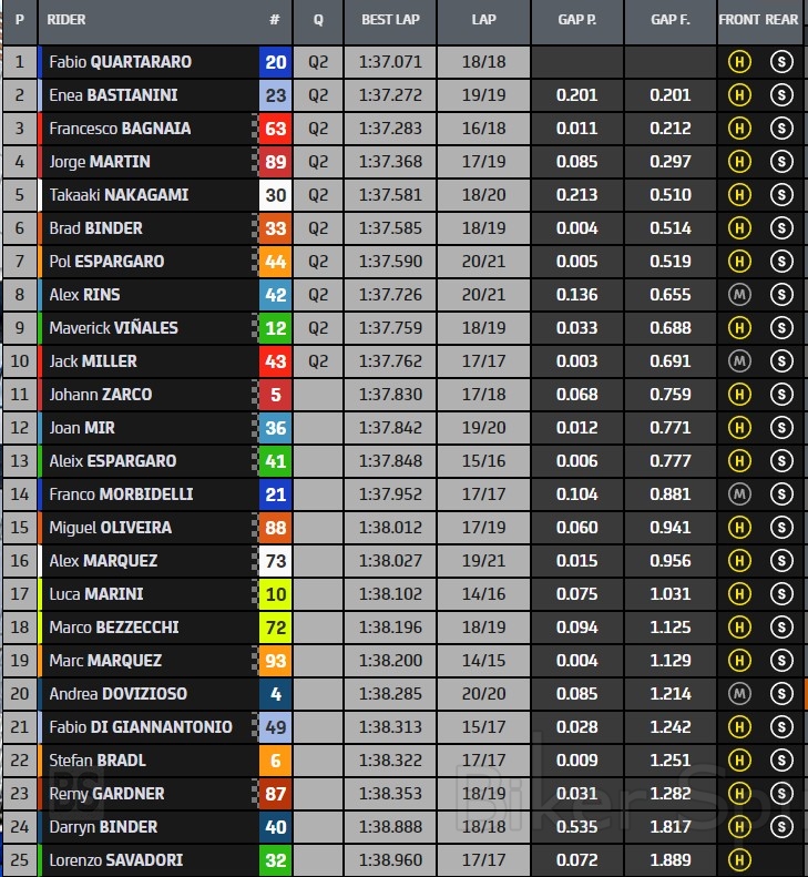 Ο Luca Marini με την Ducati της Mooney VR46 Racing Team είναι 17ος, μπροστά από τον ομόστυαλό του Marco Bezzecchi και έναν μαχητικό Marc Marquez, ο οποίος είχε δυο πτώσεις και είναι 19ος, μπροστά από τη Yamaha της WithU RNF Team του Andrea Dovizioso.