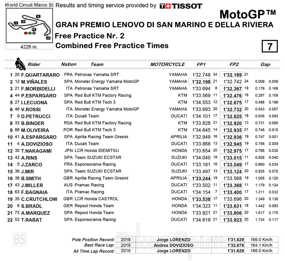 Ο Fabio Quartararo έγραψε τον ταχύτερο γύρο της ημέρας στο FP2 σταματώντας τον χρονόμετρο στο 1’32.189, αφήνοντας στην 2η θέση τον Maverick Vinales που ήταν ο ταχύτερος στο FP1, με χρόνο 1’32.198.