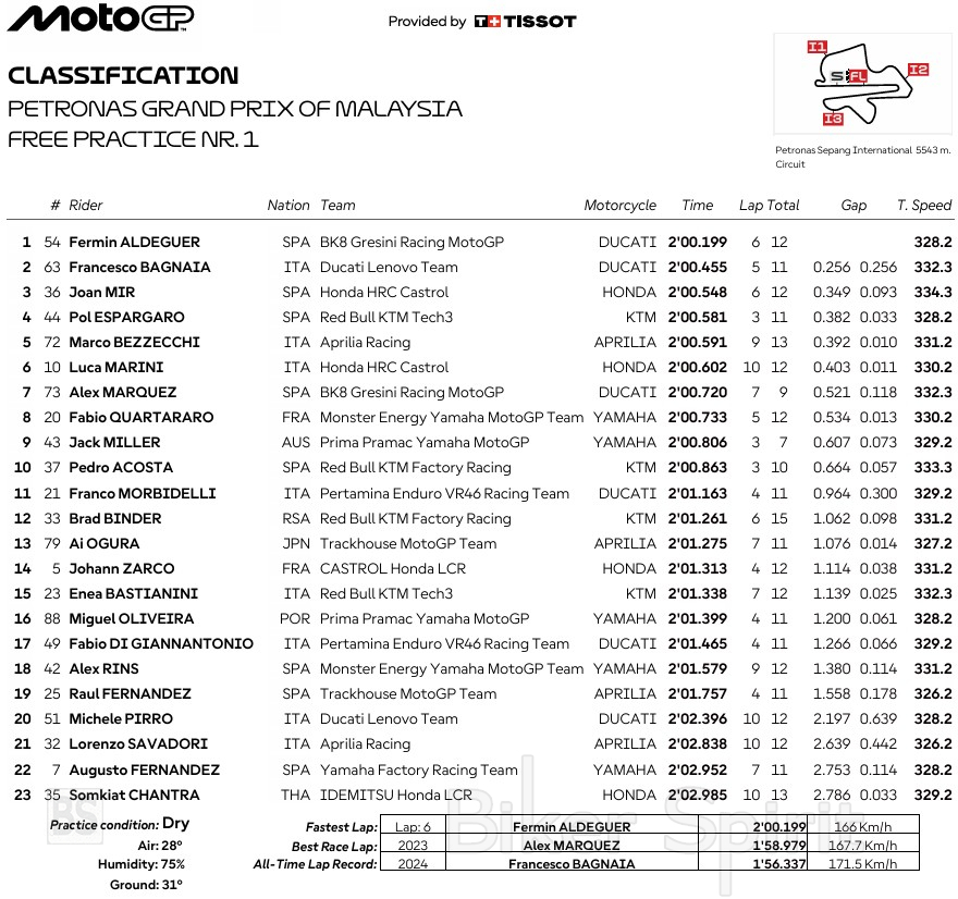 @Aldeguer54 tops a rain-disrupted FP1 #MalaysianGP pic.twitter.com/hc5CP9dqyN