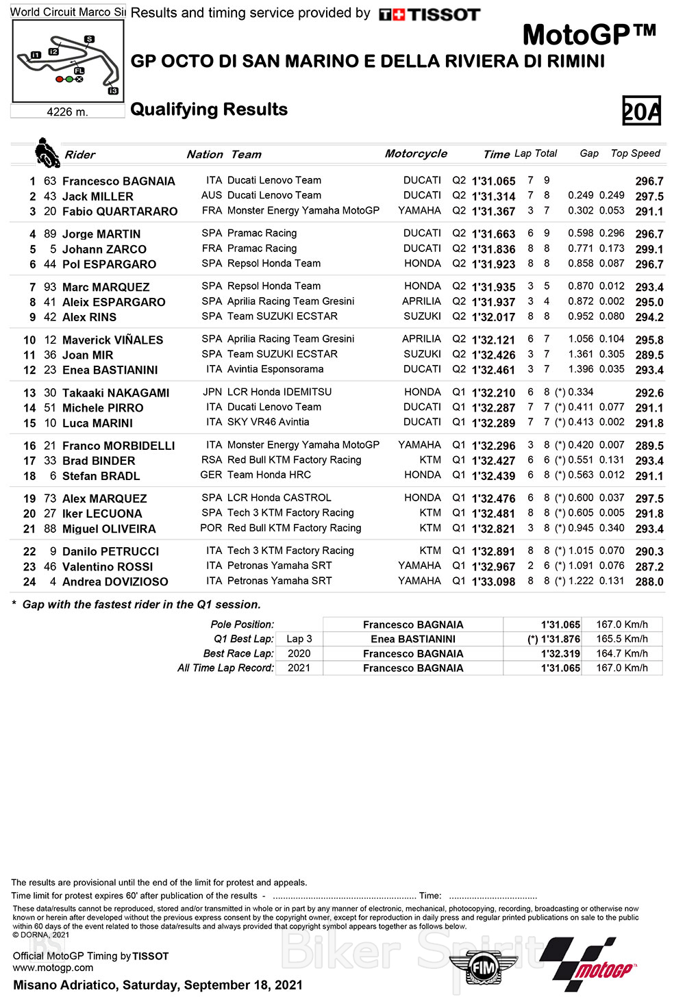 Στην δεύτερη θέση ο Jack Miller όπως και στον προηγούμενο αγώνα, θα ξεκινήσει διπλά στον ομόστυαλό του, ενώ την πρώτη σειρά στην 3η θέση θα κλείσει ο Fabio Quartararo, που είχε πτώση στον τελευταίο γύρο, ευτυχώς χωρίς συνέπειες.