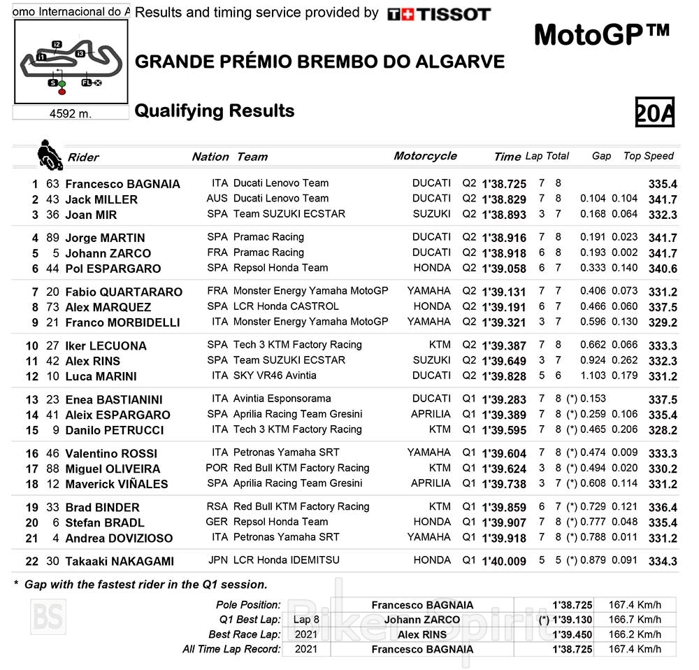 Ο νέος παγκόσμιος πρωταθλητής Fabio Quartararo (Yamaha Factory) θα ξεκινήσει από την έβδομη θέση, αφού για δεύτερη συνεχομένη φορά δεν κατάφερε να είναι στην πρώτη σειρά! Από την 8η θέση θα ξεκινήσει ο Alex Marquez (LCR Honda) μπροστά από τονFranco Morbidelli (Yamaha Factory).