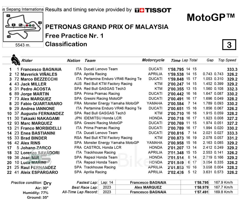 Στην 2η θέση τέλειωσε το FP1 το Aprilia του Maverick Vinales με χρόνο 01:59.538, μπροστά από το Ducati της ομάδας VR46 του Marco Bezzecchi.