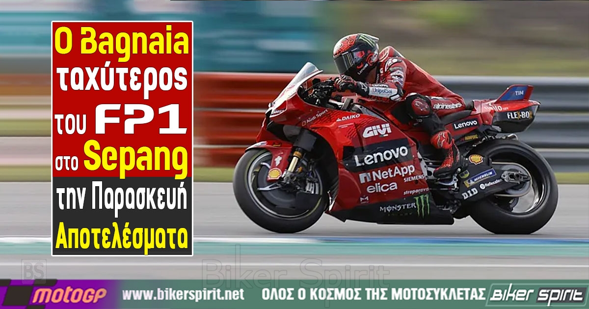 Ο Francesco Bagnaia πέτυχε τον καλύτερο χρόνο στα πρώτα ελεύθερα δοκιμαστικά FP1 του Grand Prix της Μαλαισίας στην κατηγορία MotoGP, για τον 19ο γύρο του MotoGP 2024.