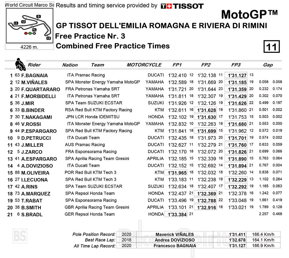 Ο Francesco Bagnaia έγραψε τον καλύτερο χρόνο στην τρίτη ελεύθερη δοκιμή FP3 του Grand Prix στην κατηγορία MotoGP, στο Misano 2.