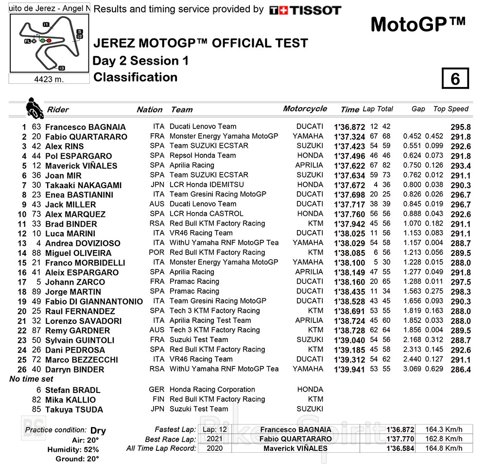 Τέταρτη και πέμπτη θέση για τον Pol Espargarò, που δοκίμασε σήμερα το πρωτότυπο Honda 2022 και τον Maverick Vinales, ο οποίος με την Aprilia προηγείται του δεύτερου Suzuki, εκείνου του Joan Mir, με τη σειρά του μπροστά από το Honda LCR του Ιάπωνα Takaaki Nakagami, που είναι στην δεύτερη θέση συνολικά του διήμερου.