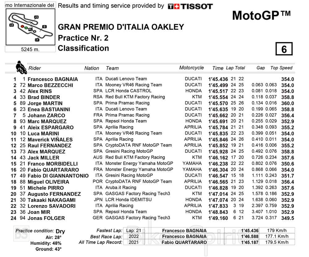 Στην 9η θέση τέλειωσε ο Aleix Espargarò (Aprilia), ο οποίος τράκαρε χθες με το ποδήλατό του και τραυματίστηκε στη δεξιά φτέρνα του), ενώ ο Luca Marini, με την Ducati Mooney VR46 Racing Team, κλείνει την δεκάδα που περνά απευθείας στο Q2!