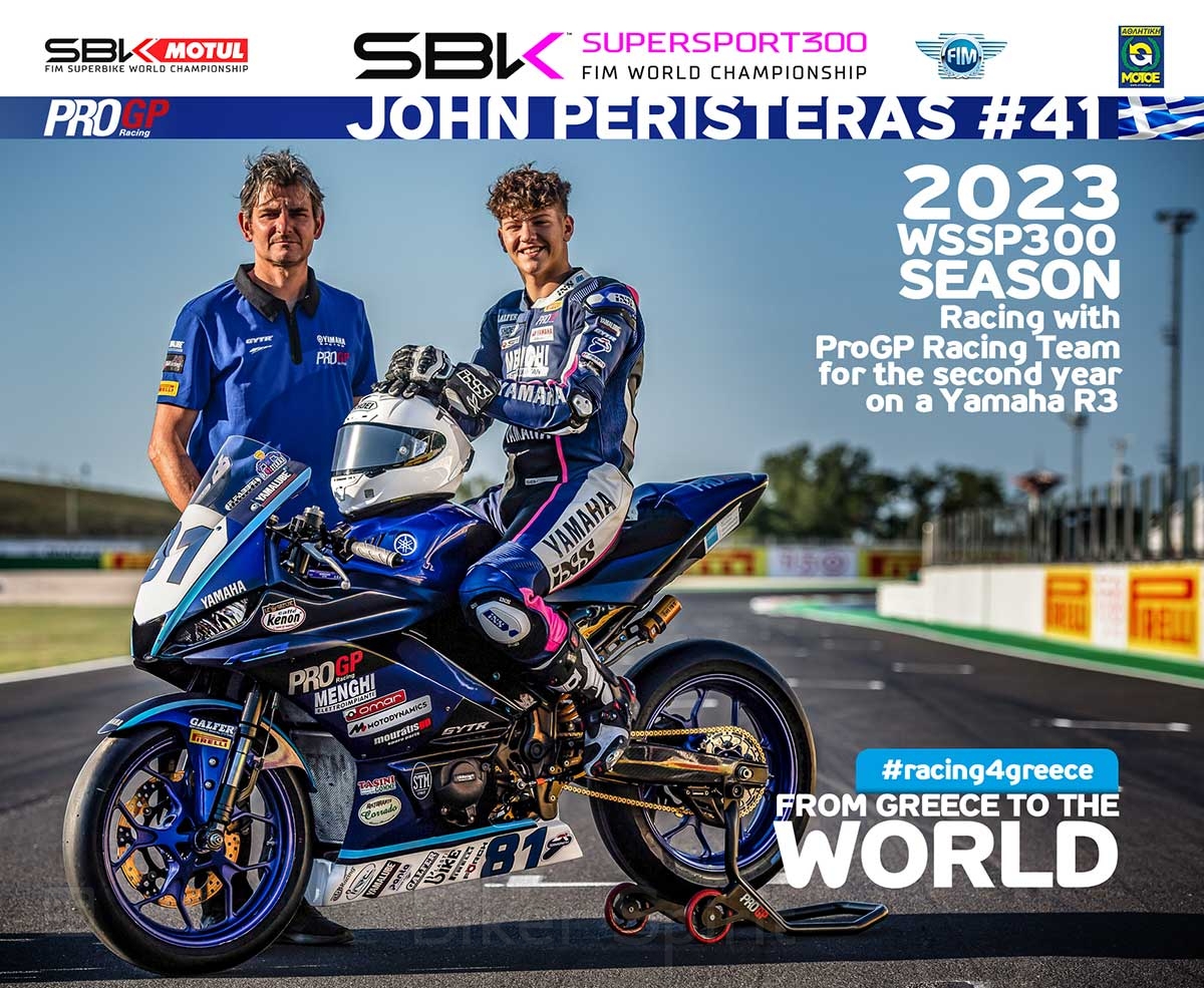 Από τη μεριά του ο Γιάννης Περιστεράς δήλωσε: “Είμαι ευχαριστημένος και ενθουσιασμένος με την ανακοίνωση της επίσημης συμμετοχής μου το 2023, για δεύτερη χρονιά στη συνέχεια, στο υψηλότερο επίπεδο του Παγκοσμίου Πρωταθλήματος WorldSBK στην κατηγορία WSSP300, στην οποία θα αγωνιστώ με την ProGP Racing, πάνω σε μια Yamaha R3 προδιαγραφών WSBK. Είμαι έτοιμος να αγωνιστώ και βελτιώνομαι μέρα με τη μέρα και με μεγαλύτερη εμπειρία. Θα κάνω το καλύτερό μου για την Ομάδα μου, την οικογένειά μου, για τον κόουτς μου Γιάννη Μπούστα, για την Ελλάδα και βέβαια για όλους τους χορηγούς μου, τους υποστηρικτές, τους οπαδούς και τους φίλους. Σας ευχαριστώ τόσο πολύ που πιστεύετε σε μένα”.