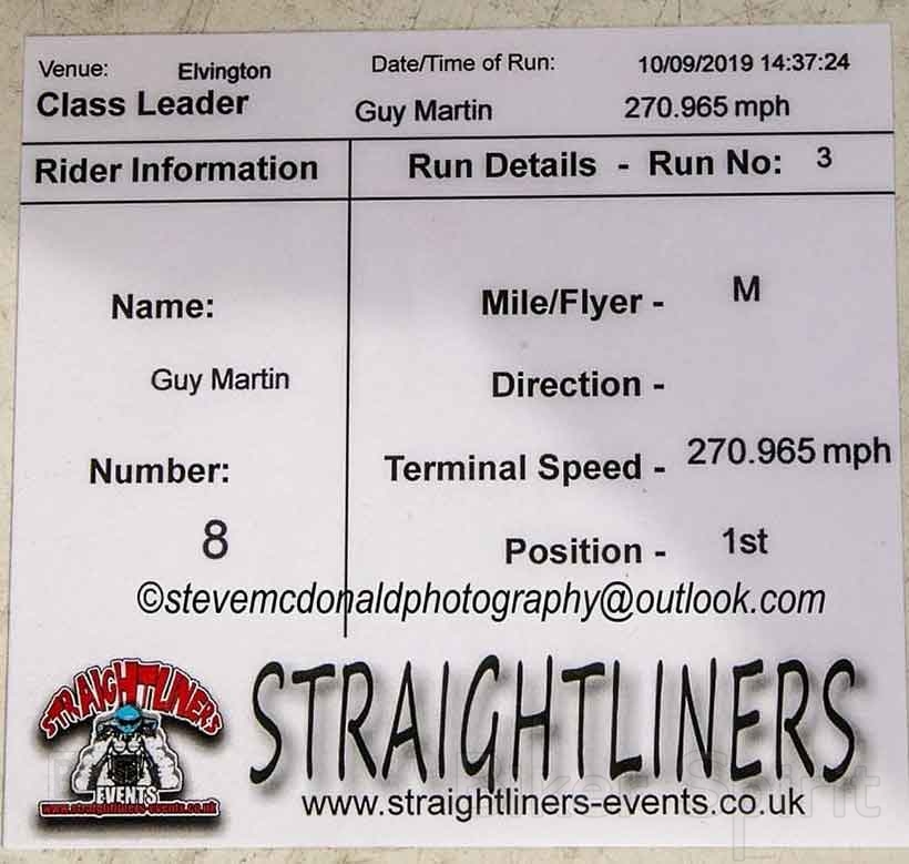Το 2019, ο Martin κατάφερε και έφτασε στην ταχύτητα 270,9 mph (435,9 km / h) σε ένα μίλι κατά τη διάρκεια δοκιμών στο Elvington Airfield. Το 2020, δοκίμασε ξανά, αυτή τη φορά φτάνοντας στα 282 mph (453,8 km / h), μια προσπάθεια που ο Guy Martin θέλει να ολοκληρώσει καθ ‘όλη τη διάρκεια του 2021 για να πετύχει το ορόσημο των 300 mph και να μπει στο βιβλίο ρεκόρ Guinness ως ο ταχύτερος οδηγός του πλανήτη.