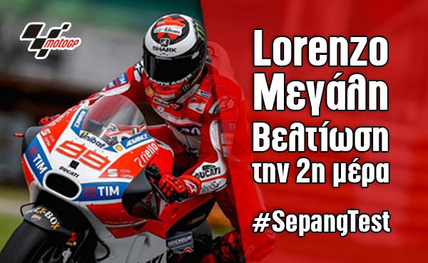 Ο Dovizioso (Ducati Team) σήμερα 2η ημέρα, μετά την πολύ καλή χθεσινή μέρα στη Μαλαισία, έκανε 42 γύρους με καλύτερο χρόνο 2:00,441, περίπου μισό δευτερόλεπτο κάτω από τον ρυθμό του την πρώτη ημέρα. Ο Jorge Lorenzo, ο οποίος τελείωσε την πρώτη μέρα στην 17η θέση, σήμερα βελτιώνοντας τον χρόνο του σχεδόν ένα δευτερόλεπτο ανέβηκε στην 8η θέση, μόλις 0.043s από τον ομόσταυλό του. Ο Ισπανός δείχνει πιάσμα και διάθεση να βρει την μοτοσυκλέτα, αφού έκανε τους περισσότερους γύρους από κάθε άλλον με 66 γύρους, παρά το χαμένο χρόνο από τις καιρικές συνθήκες!