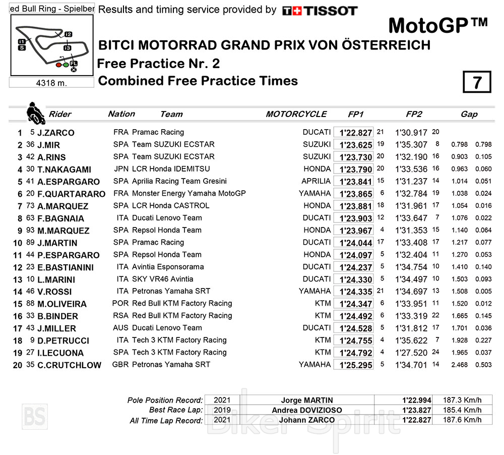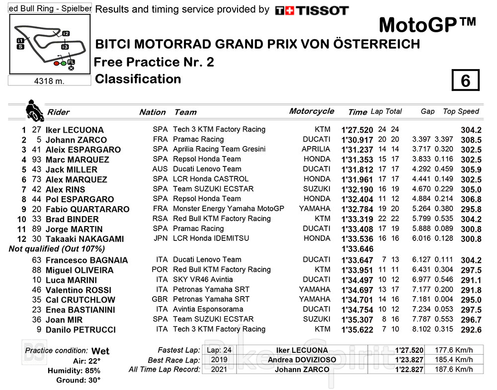 Έτσι στην προσωρινή δεκάδα που περνά απευθείας στο Q2 είναι οι: Johann Zarco, Joan Mir, Alex Rins, Takaaki Nakagami, Aleix Espargarò, Fabio Quartararo, Alex Marquez, Francesco Bagnaia, Marc Marquez και Jorge Martin.