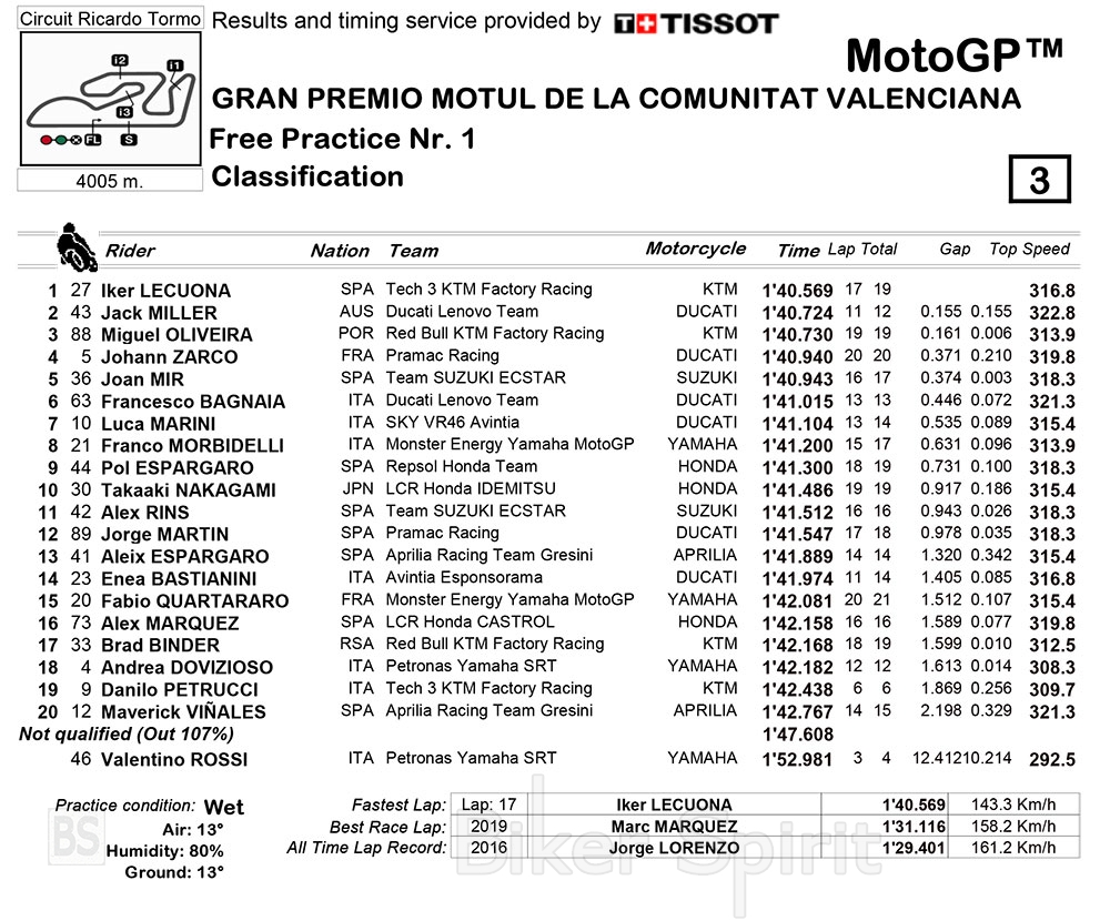 Ο ταχύτερος σε αυτές τις καιρικές συνθήκες ήταν ο Iker Lecuona (KTM Tech 3), ο οποίος θα αγωνιστεί για τελευταία φορά στο MotoGP την Κυριακή πριν πάει στη Honda στα WSBK.