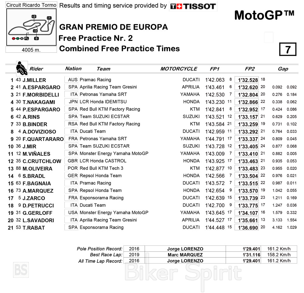 Στην 7η θέση βρέθηκε ο Νοτιοαφρικανικός της KTM, Brad Binder, μπροστά από τον Andrea Dovizioso (Ducati) και του Fabio Quartararo (Yamaha Petronas).
