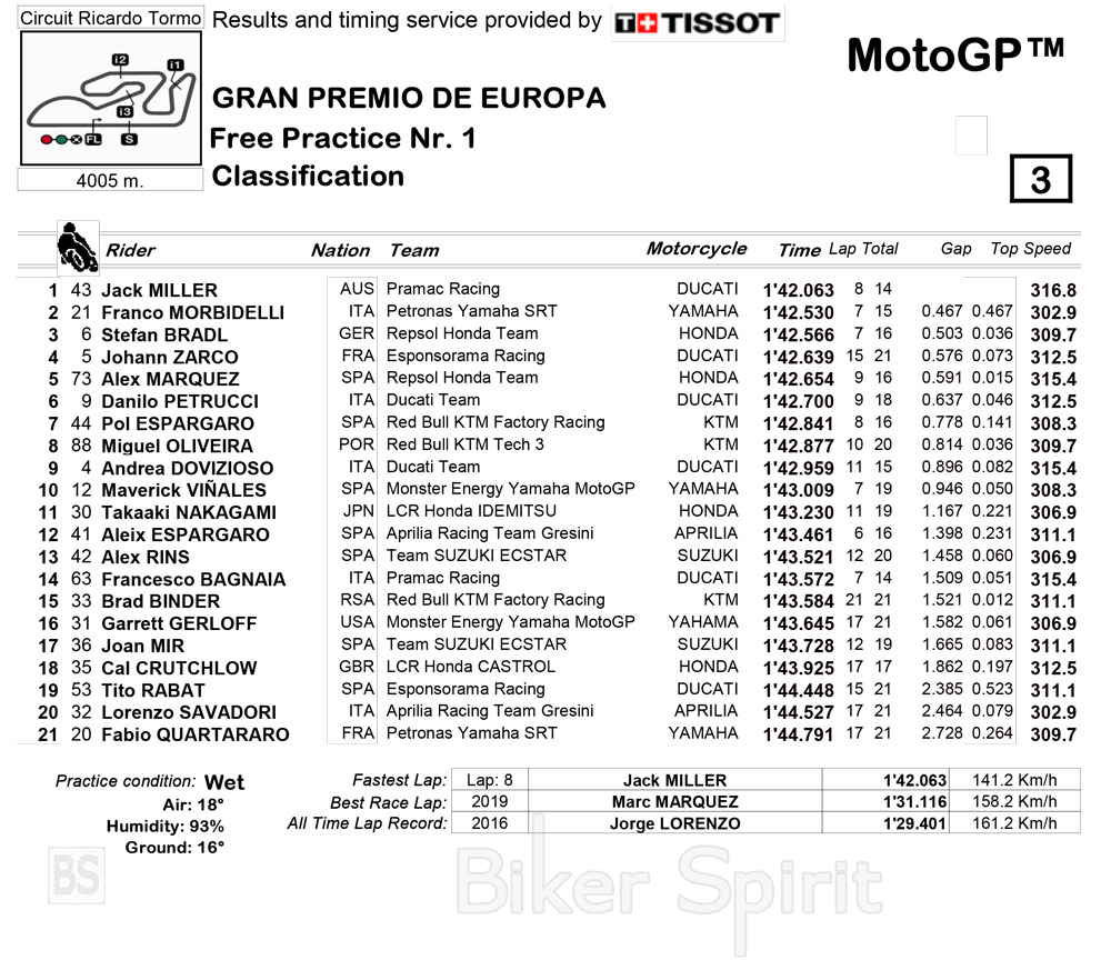 Ο ταχύτερος του FP1 ήταν ο Jack Miller, ο οποίος έφερε το Ducati της Pramac στην κορυφή με χρόνο 1: 42.063.
