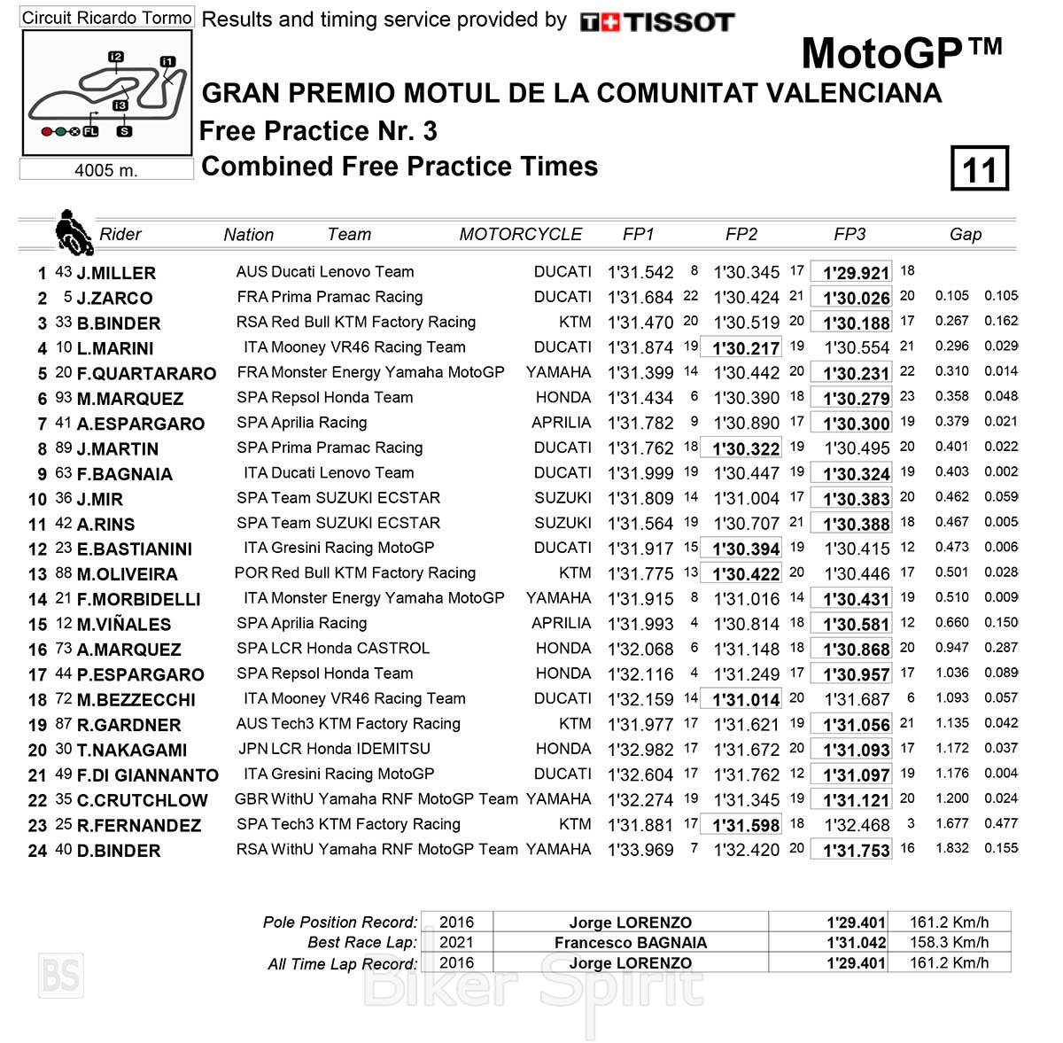 Ταχύτερος του FP3 αλλα και των συνδυασμένων χρόνων που μετράνε για την απευθείας είσοδο στο Q2, ήταν ο οδηγός της εργοστασιακής Ducati, Jack Miller με χρόνο 1.29.921, και ήταν ο μόνος οδηγός που κατέβηκε στο 1.29s.