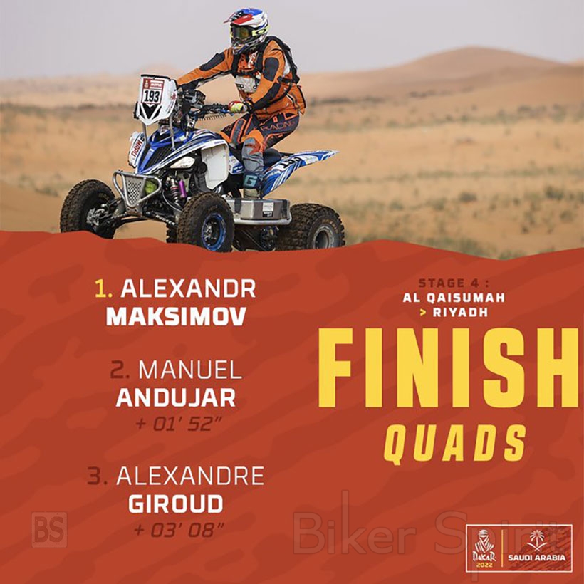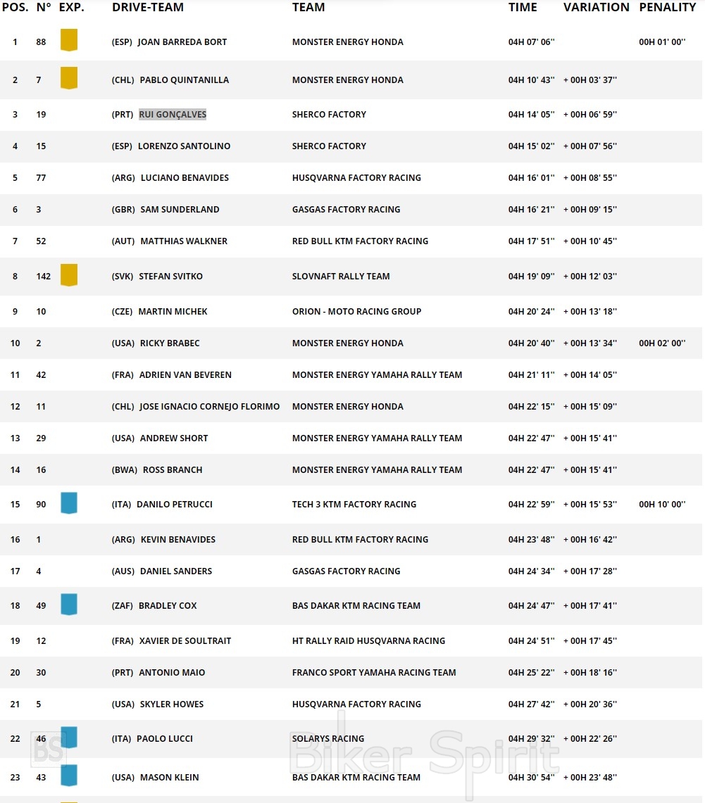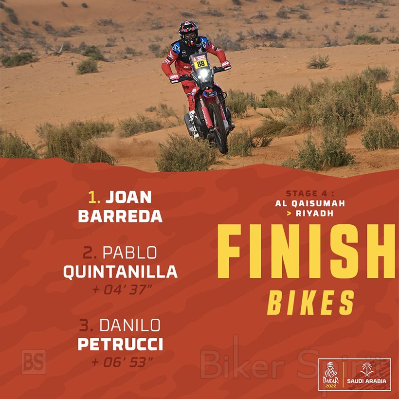 Ο Pablo Quintanilla, τερμάτισε δεύτερος λίγο πάνω από τέσσερα λεπτά πίσω από τον συμπαίκτη του. Η μεγάλη έκπληξη αυτού του τέταρτου σταδίου ήταν ο πρώην αναβάτης του MotoGP, Danilo Petrucci, ολοκληρώνοντας την ημέρα στην τρίτη θέση έξι λεπτά πίσω από τον νικητή. Μια ποινή 10 λεπτών που πηρέ ο Ιταλός τον έριξε στην 15η θέση της σημερινής ειδικής!
