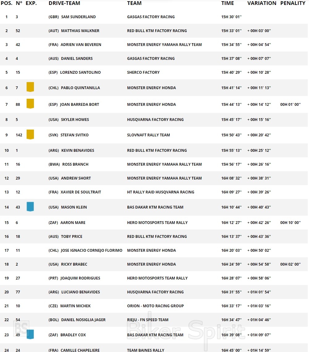 Αξίζει επίσης να αναφερθεί την εξαιρετική επίδοση των οδηγών της Sherco, που τερμάτισαν ακριβώς πίσω από τους 3 κορυφαίους, με τον Rui Gonçalves και τον Lorenzo Santolino.