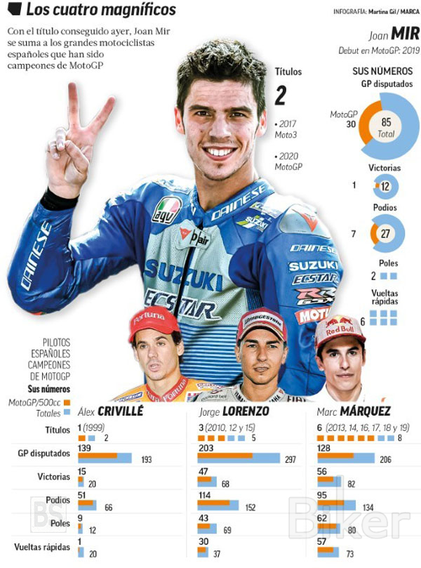 Ο Mir, ο οποίος έχει ήδη κερδίσει το Παγκόσμιο Πρωτάθλημα στη Moto3, γίνεται ο τέταρτος Ισπανός αναβάτης με τίτλο στην μεγάλη κατηγορία MotoGP, μπαίνοντας στον κλαμπ των Crivillé, Lorenzo και Márquez.