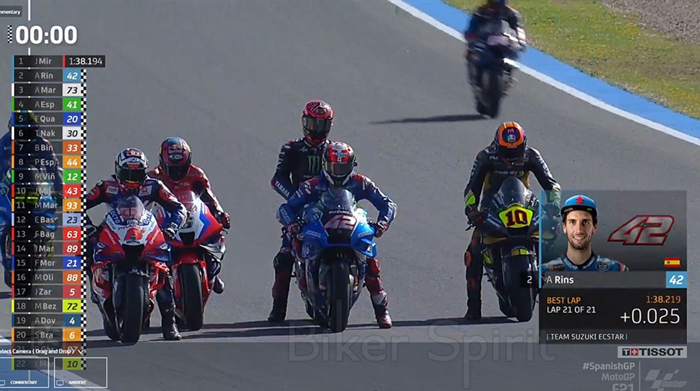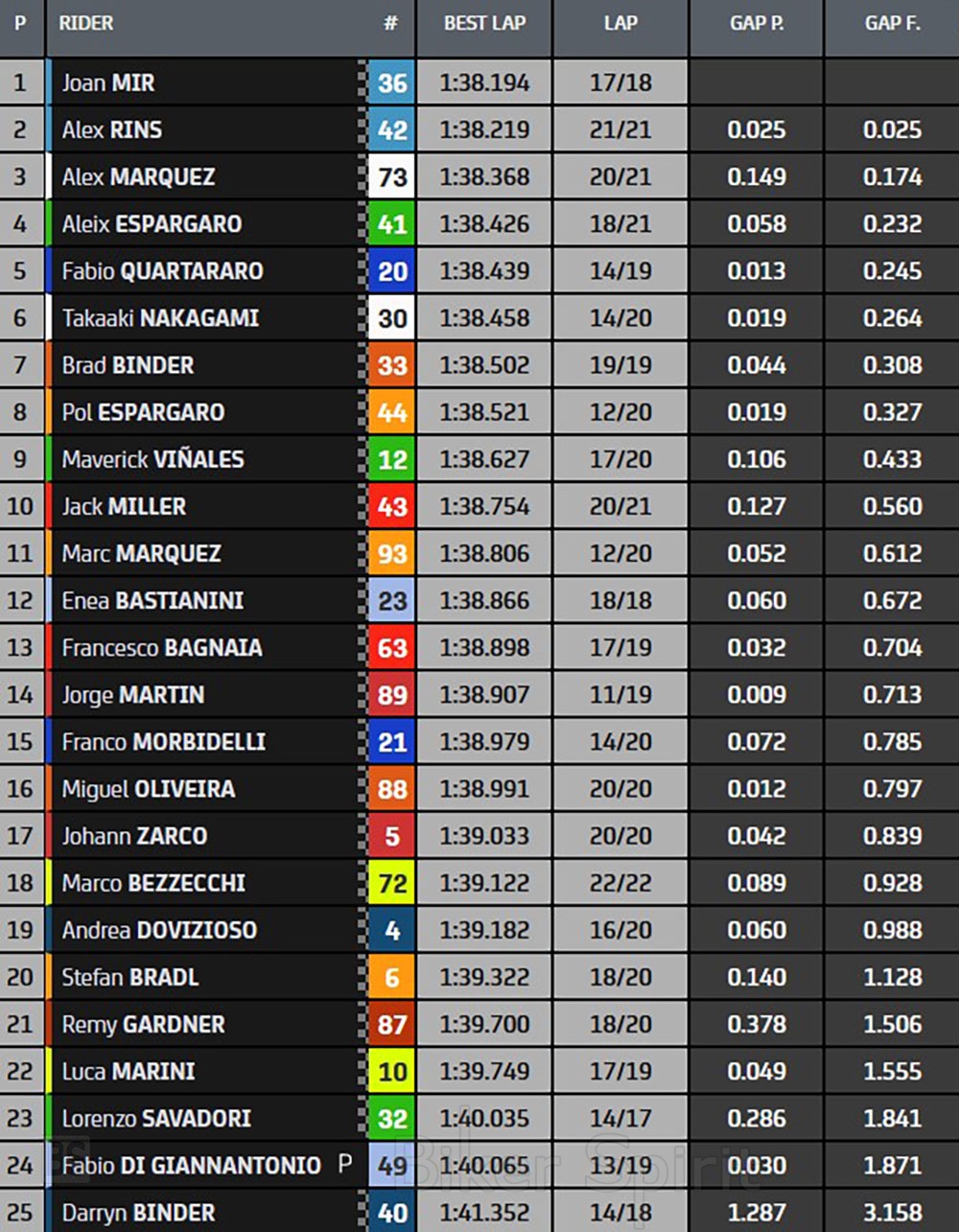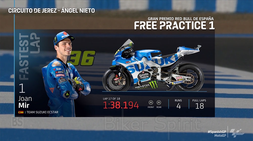 Ο Joan Mir σημείωσε τον καλύτερο χρόνο, με το GSX-RR σταματώντας το χρονόμετρο στο 1:38.194 μπροστά από τον ομόστυαλό του, Alex Rins, με μόλις 25 χιλιοστά διαφορά.
