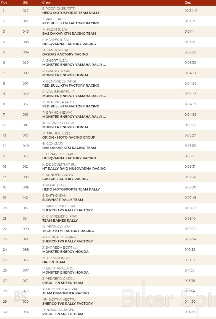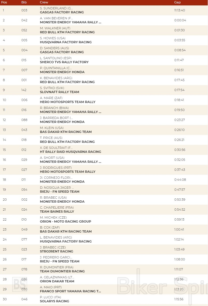 Ο Sam Sunderland τερματίζει στη 17η θέση με 7′ 30” καθυστέρηση, αλλά παρόλα αυτά ο οδηγός της GasGas συνεχίζει να διατηρεί την πρώτη θέση στην κορυφή της γενικής κατάταξης. Αλλά είναι ένα πολύ μικρό πλεονέκτημα, δεδομένου ότι ο Van Beveren, που πήγε καλύτερα από αυτόν σήμερα, είναι μόλις 4 δευτερόλεπτα πίσω του. Επίσης και ο Walkner πλησιάζει, με ενάμιση λεπτό από την κορυφή, στην γενική κατάταξη