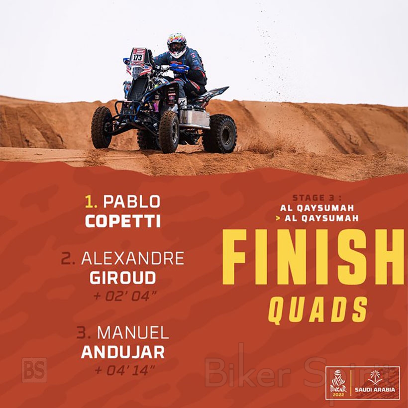 Με δέκα δευτερόλεπτα πίσω από τον Brabec ακολουθεί ο πρώην συμπαίκτης του Kevin Benavides (KTM). Ο Adrien Van Beveren (Yamaha) τερμάτισε ένατος με 4’43 ” διαφορά, ο Matthias Walkner (KTM) δέκατος με 4′ 52″ διαφορά από την κορυφή κλείνοντας την κορυφαία δεκάδα της 3ης ειδικής.