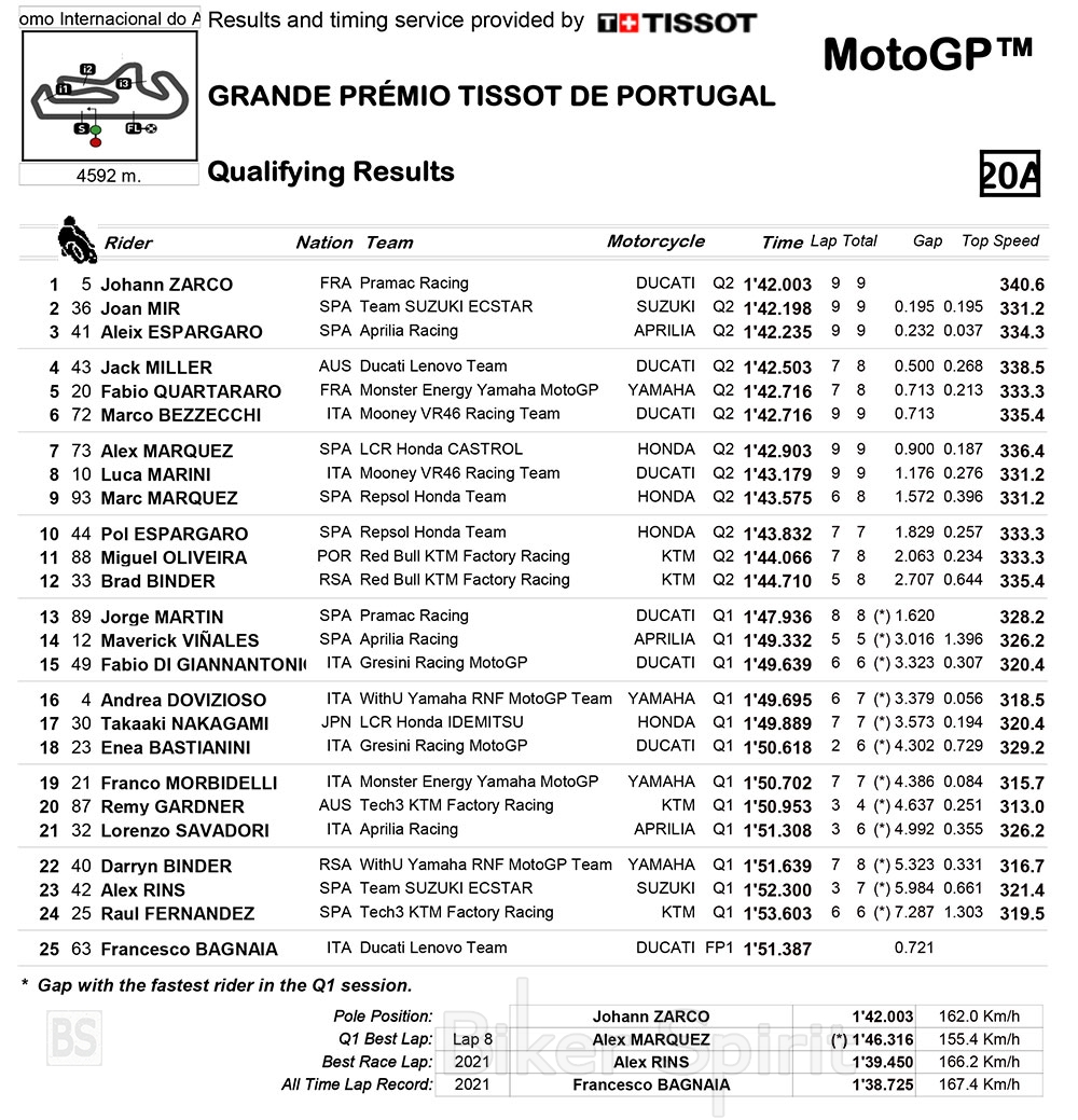 Για τον Zarco αυτή είναι η έβδομη pole στην κορυφαία κατηγορία, η 58η για την Ducati, η τρίτη pole της ομάδας στη σεζόν μετά τα Losail και Austin του Jorge Martin.