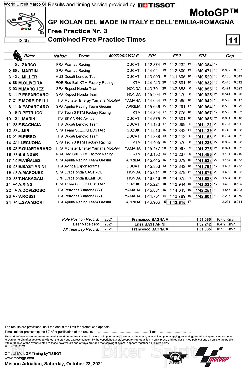 Και πάλι ο καιρός ήταν αυτός που καθόρισε την κατάσταση στο FP3, αφού η βροχή ήταν και πάλι εκεί στο Misano World Circuit Marco Simoncelli, όπου αύριο είναι προγραμματισμένος ο 16ος γύρος του Παγκοσμίου Πρωταθλήματος 2021 και δύσκολα θα είναι στεγνός σύμφωνα με τις προβλέψεις.