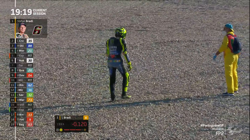 Ο Valentino Rossi δείχνει να έχει προβλήματα αφού έκανε τον 21ο χρόνο, ενώ είχε και μια πτώση, ευτυχώς χωρίς συνέπειες. Ο «Γιατρός» έχει μια διαφορά από την κορυφή σχεδόν δύο δευτερολέπτων, για την ακρίβεια 1.862 δευτερόλεπτα.