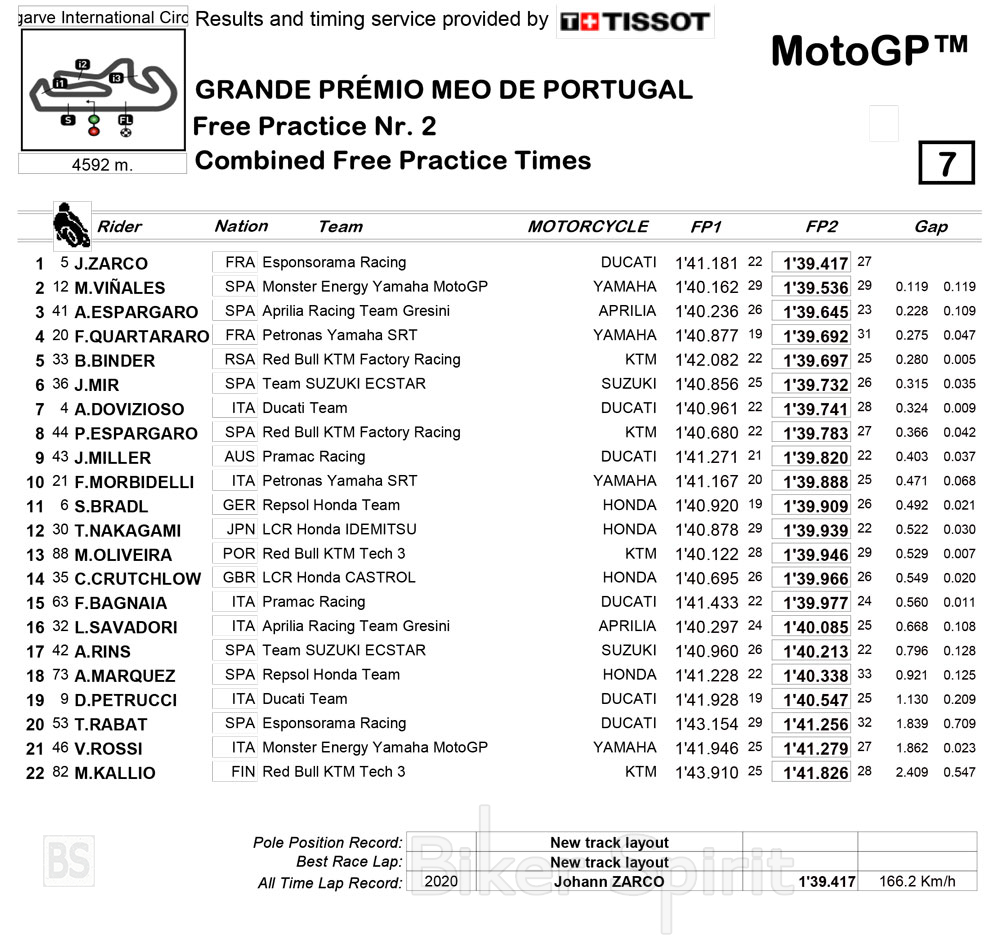 Στην 4η θέση έχουμε την Yamaha της Petronas με τον Fabio Quartararo, μπροστά από το KTM του Brad Binder, ενώ ο νέος Παγκόσμιος Πρωταθλητής του 2020, Joan Mir κλείνει την πρώτη εξάδα με διαφορά 0.315s από τον πρώτο!