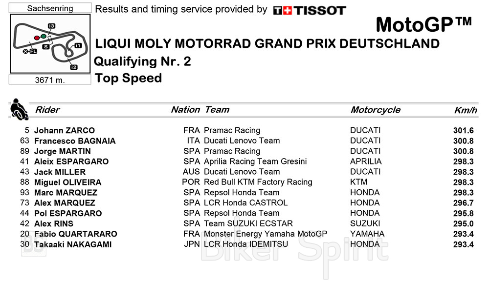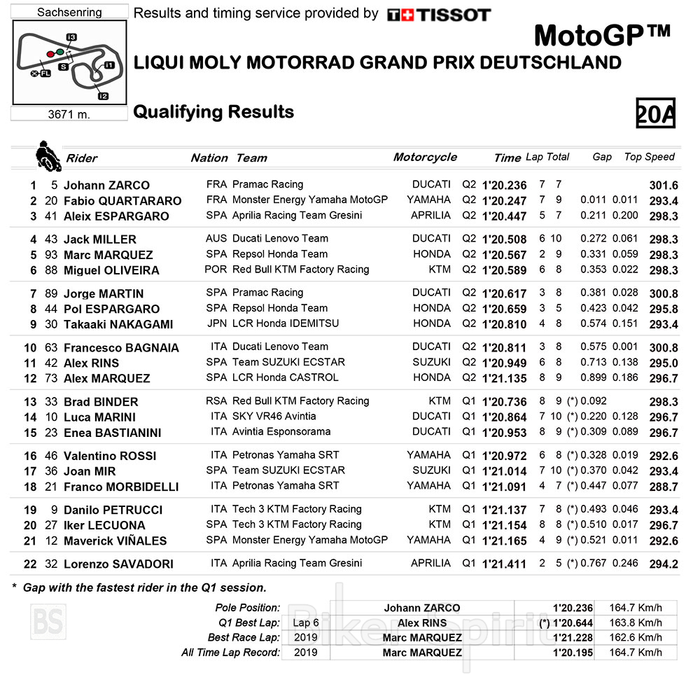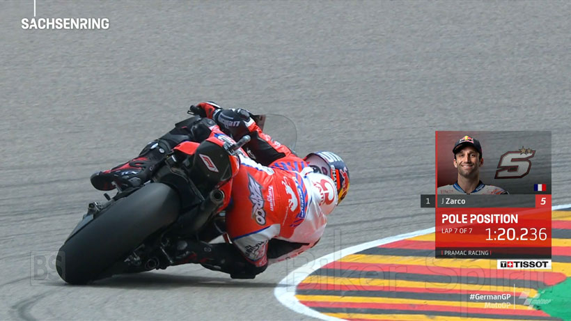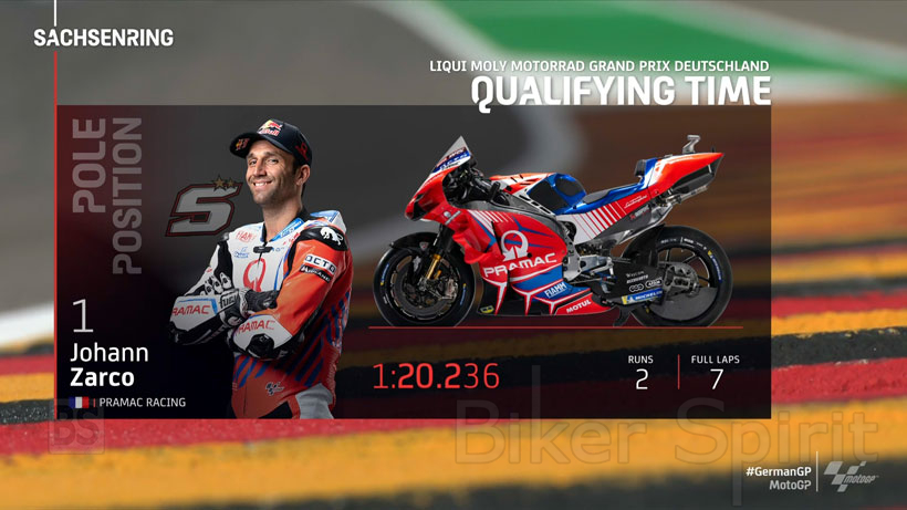Ο Johann Zarco με χρόνο 1:20.236, κέρδισε την pole position στο Sachsenring για τον 8ο γυρο του 2021, σε μια επεισοδιακή περίοδο προκριματικών, οπού είδε τον Γάλλο να πέφτει ακριβώς μετα την pole! οι κίτρινες σημαίες δεν άφησαν κανέναν να βελτιωθεί. Η συνεδρία ουσιαστικά τελείωσε, νωρίτερα από το αναμενόμενο. Οι υπόλοιποι αναβάτες έπρεπε να συμβιβαστούν με τις θέσεις που είχαν εκείνη τη στιγμή.