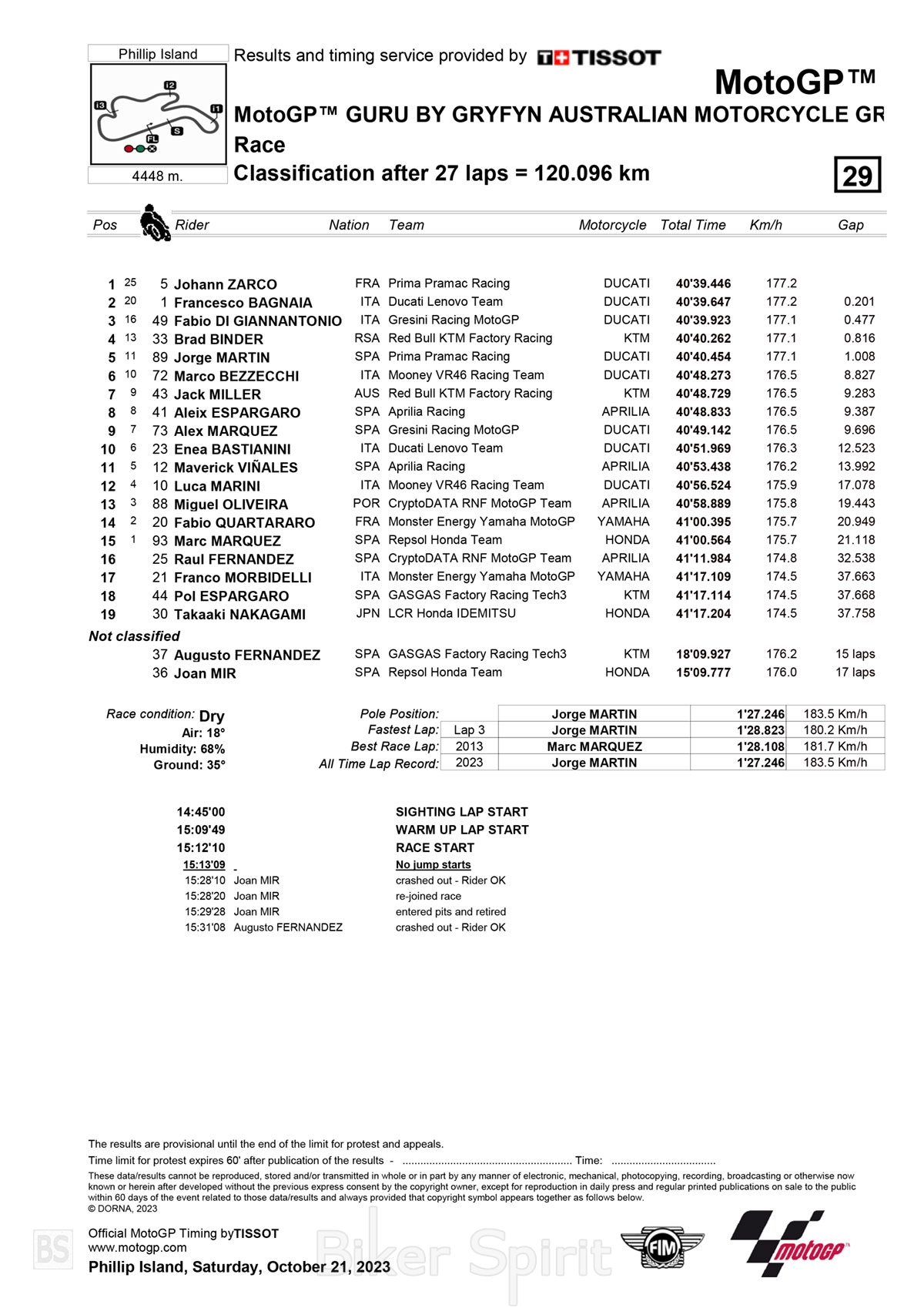 Ο Jorge Martin που οδήγησε τον αγώνα από την αρχή του αγώνα, δεν άντεξε τελικά, αποδεικνύοντας την λάθος επιλογή του μαλακού ελαστικού που του έδωσε το πλεονέκτημα στην αρχή, αλλα στο τέλος τον πρόδωσε και όχι μόνο έχασε την πρώτη θέση αλλα και το βάθρο τερματίζοντας στην 5η θέση!