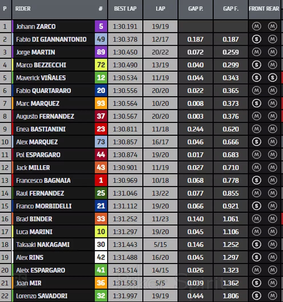 Ο Pecco Bagnaia #1 δεν είχε εύκολη περίοδο, ως επί το πλείστον ήταν πίσω και στο τέλος τερμάτισε 13ος, 0,778 δευτερόλεπτα από την κορυφή και περίπου μισό δευτερόλεπτο πίσω από τον Martin.
