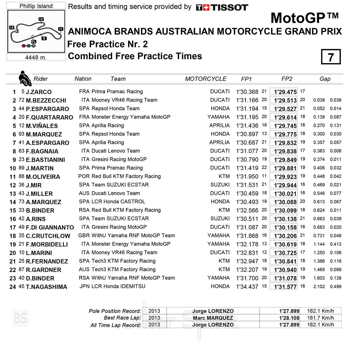 Ενδέκατη θέση για το πρώτο KTM του Miguel Oliveira, με τον Πορτογάλο νικητή στο Buriram να προηγείται της Suzuki του Joan Mir που επιστρέφει και της Ducati του Jack Miller. Να σημειωθεί ότι οι πρώτοι 18 οδηγοί βρίσκονται σε μόλις 0,731 δευτερόλεπτα.