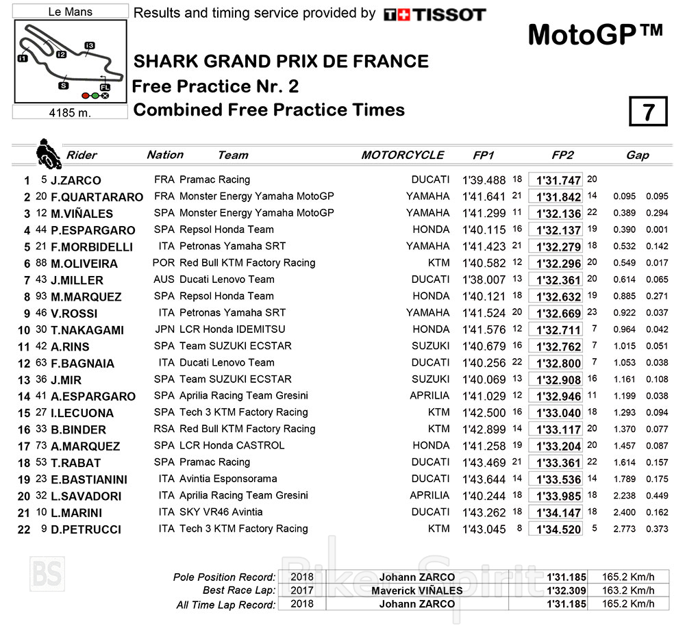 Δύο Γάλλοι ταχύτεροι στις δεύτερες ελεύθερες δοκιμές FP2 του Γαλλικού Grand Prix, για τον πέμπτο γύρος της κατηγορίας MotoGP στο Le Mans, όπου έγιναν σε στεγνή πίστα!