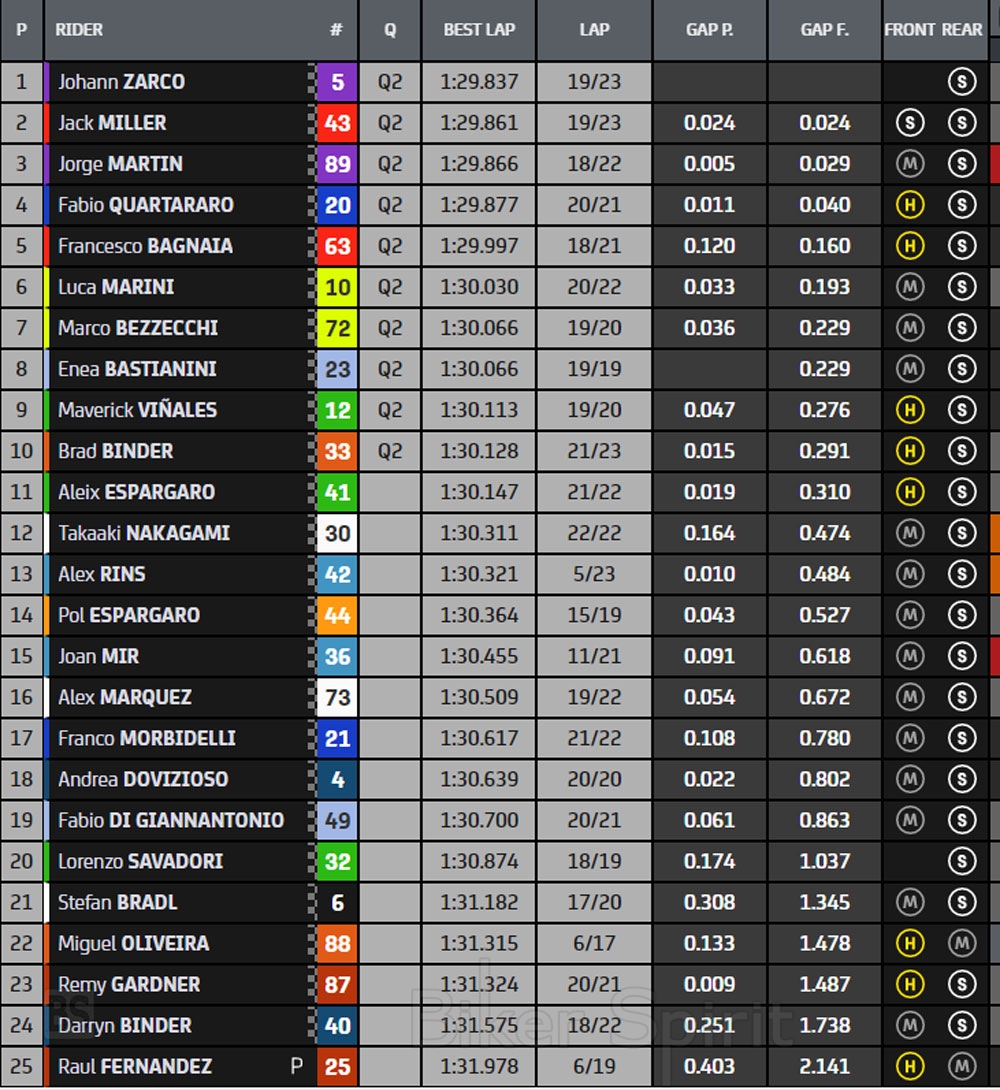 Στην 9η θέση τέλειωσε το πρώτο Aprilia με τον Maverick Vinales και χρόνο 1.30.133 και τον KTM του Brand Binder που κλείνει την πρώτη δεκάδα που περνά προσωρινά στο Q2.