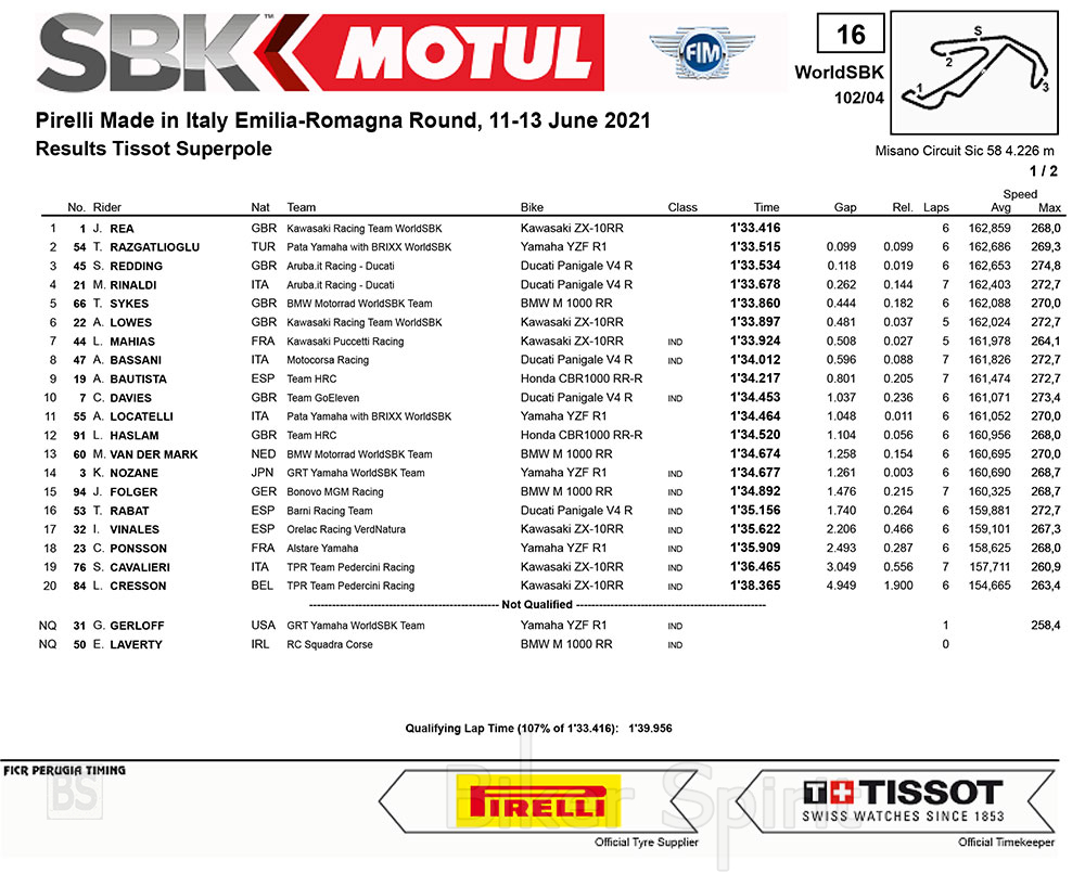 Το hat-trick (τρεις συνεχόμενες φορές) στις pole position για το 2021 έκανε, με χρόνο 1’33.416, ο Rea που είναι νέο ρεκόρ, και έτσι θα ξεκινήσει τον πρώτο αγώνα στο Misano από την πρώτη θέση, μπροστά από τον Toprak Razgatlioglu και τον Scott Redding, που κλείνει την πρώτη σειρά εκκίνησης.