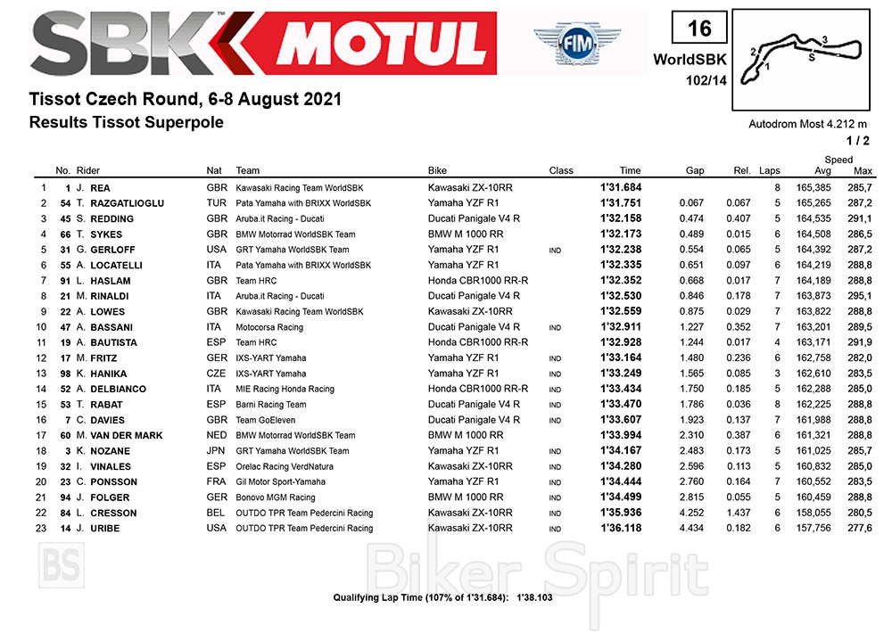 Με χρόνο 1’31.684 , ο ηγέτης του πρωταθλήματος, Jonathan Rea (Kawasaki Racing Team WorldSBK), κέρδισε την πρώτη pole position σε αυτή την πίστα, στο Autodrom Most ,που είναι καινούρια για το πρωτάθλημα