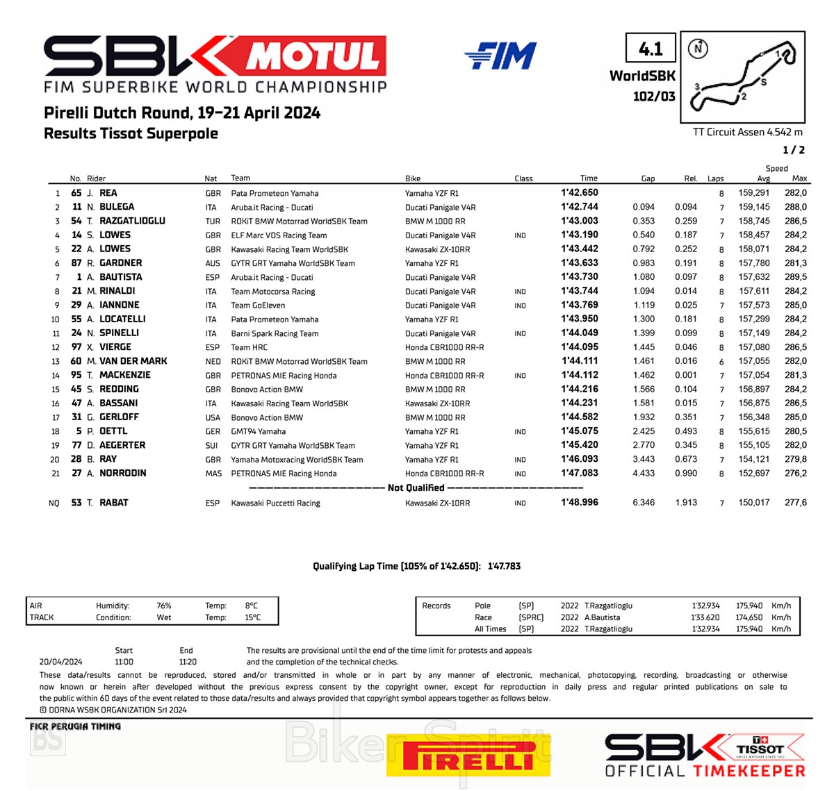 Ο Rea #65 έχει ένα δύσκολο ξεκίνημα έως τώρα με την νέα του ομάδα, αλλά τώρα εκμεταλλεύτηκε τέλεια τις μικτές συνθήκες καιρού και κέρδισε την pole position με χρόνο 1’42.650s, σε μια πίστα στην οποία είχε τόση επιτυχία, στο παρελθόν.