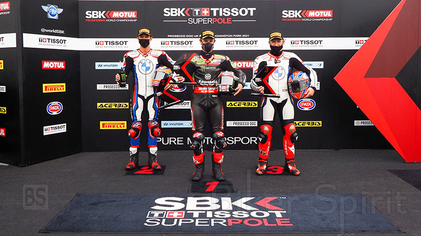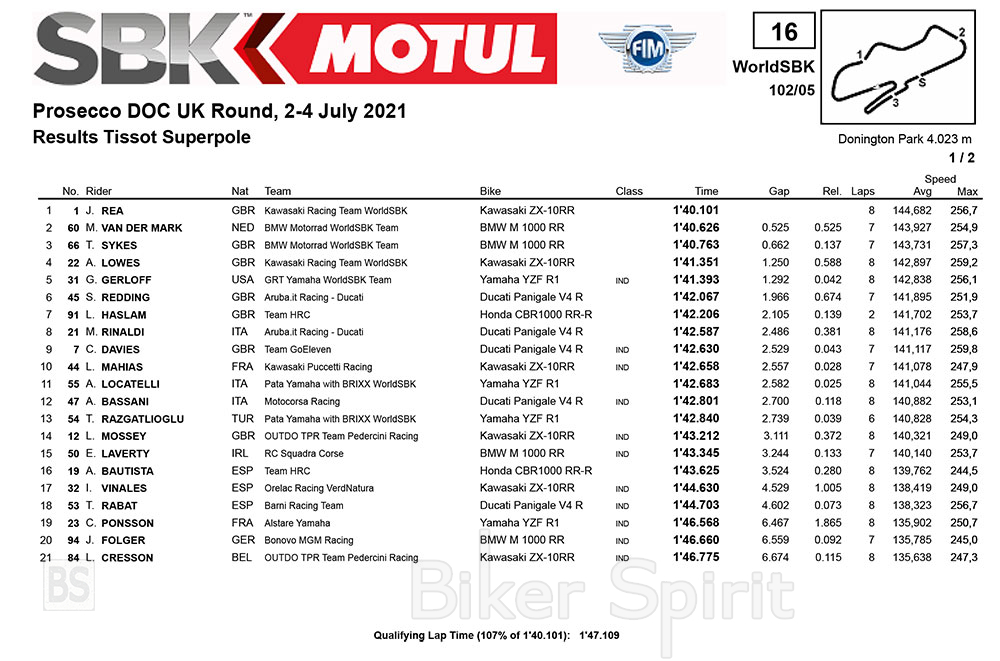 Η συνεδρία Superpole στο Donington Park πραγματοποιήθηκε σε βρεγμένη πίστα και ήταν μια ιστορική pole position για τον Jonathan Rea (Kawasaki Racing Team WorldSBK) καθώς κέρδισε την τέταρτη pole position του 2021, και είναι η πρώτη φορά που κέρδισε τέσσερις συνεχόμενες pole μιας σεζόν στην καριέρα του.