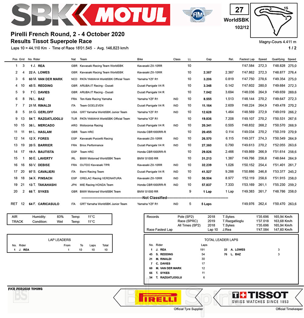 Ο Michael Ruben Rinaldi ήταν στην έβδομη θέση με τον Αμερικανό Garrett Gerloff στην όγδοη θέση. Ο Toprak Razgatlioglu τερμάτισε στην 9 θέση , μπροστά από τους Leandro Mercado και τον Leon Haslam.