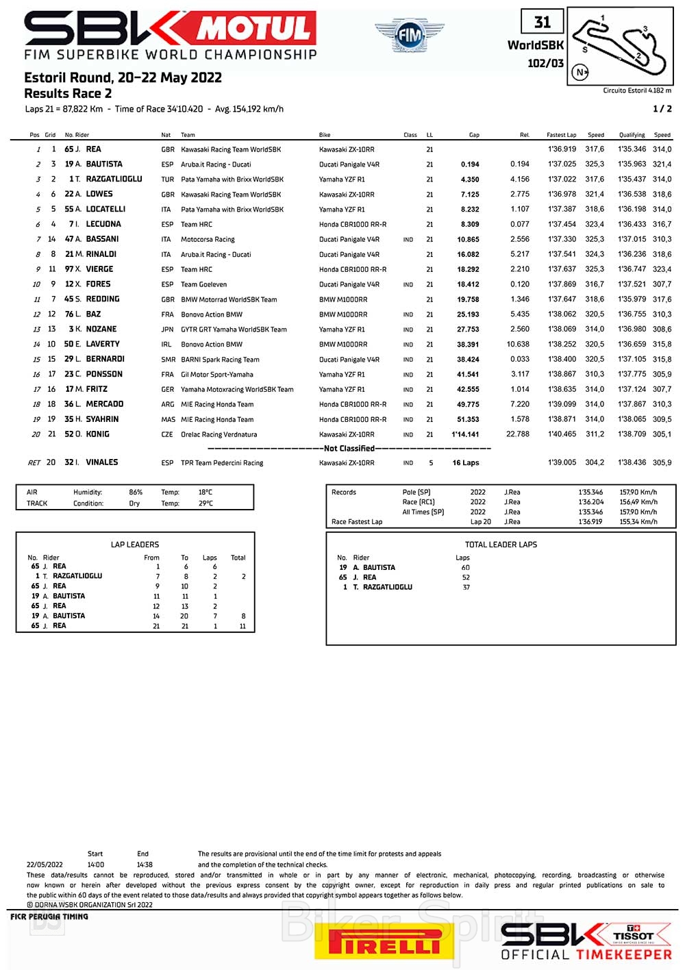 Η νίκη αυτή του Rea σημαίνει ότι έχει πλέον 117 νίκες WorldSBK και 223 βάθρα, ενώ η Kawasaki πλησιάζει τώρα το ορόσημο των 500 βάθρων. αυτή τη στιγμή είναι στα 497 μετά από άλλα τρία βάθρα αυτό το Σαββατοκύριακο. Ο Bautista σημαίνει ότι έχει πλέον 36 βάθρα στην καριέρα του στο WorldSBK και εννέα συνεχόμενα, ενώ ο Razgatlioglu έχει 61 βάθρα που τον φέρνουν στο ίδιο επίπεδο με τους Frankie Chili και James Toseland στο WorldSBK.