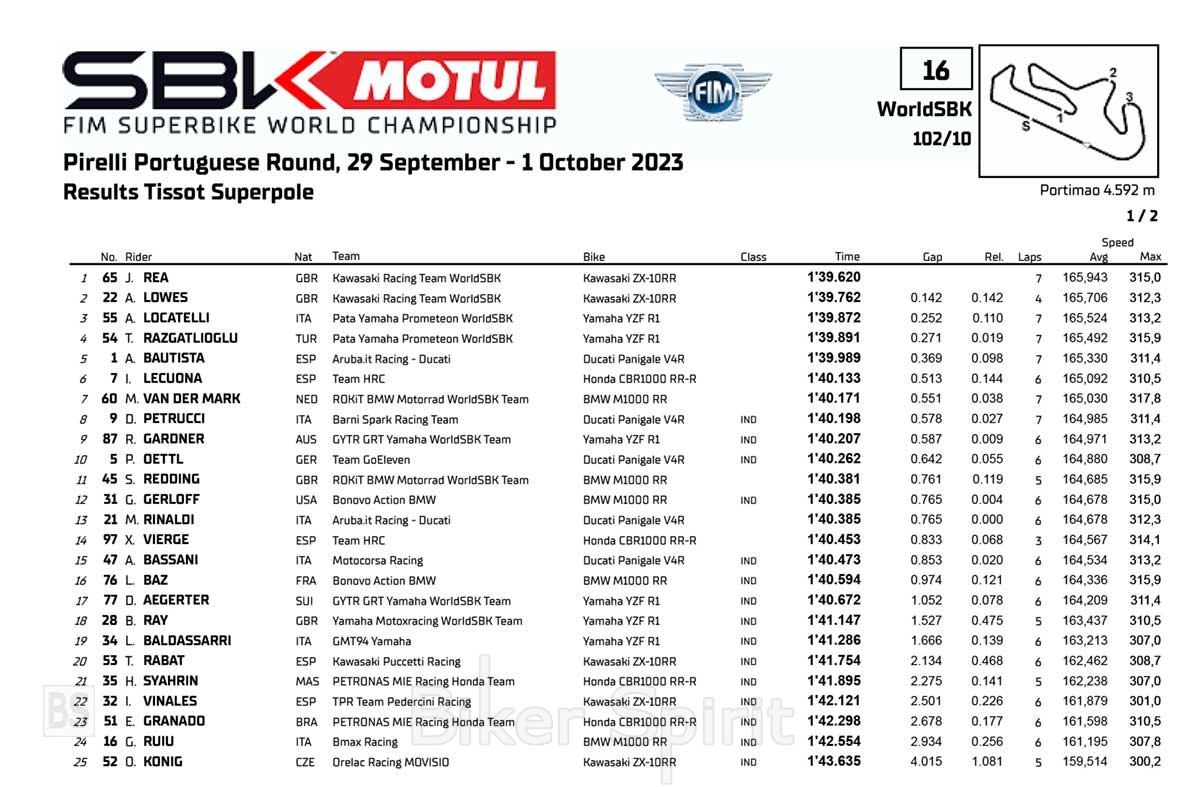 Τέταρτη θέση για τον Toprak Razgatlioglu (Pata Yamaha Prometeon WorldSBK), που θα δώσει μάχη με τον Alvaro Bautista (Aruba.it Racing – Ducati) που θα ξεκινήσει δίπλα του από την 5η θέση, ενώ την εξάδα κλείνει ο Iker Lecuona (Team HRC) με +0,513s διαφορά από την κορυφη!