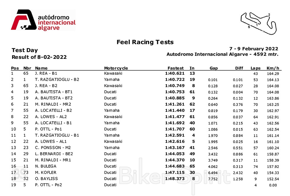 Τρεις κατασκευαστές έδωσαν το παρόν στις δοκιμές στο Portimao, και διεκδίκησαν μια θέση μέσα στην πρώτη τριάδα με μόλις ένα δέκατο να χωρίζει τις Kawasaki, Yamaha και Ducati.