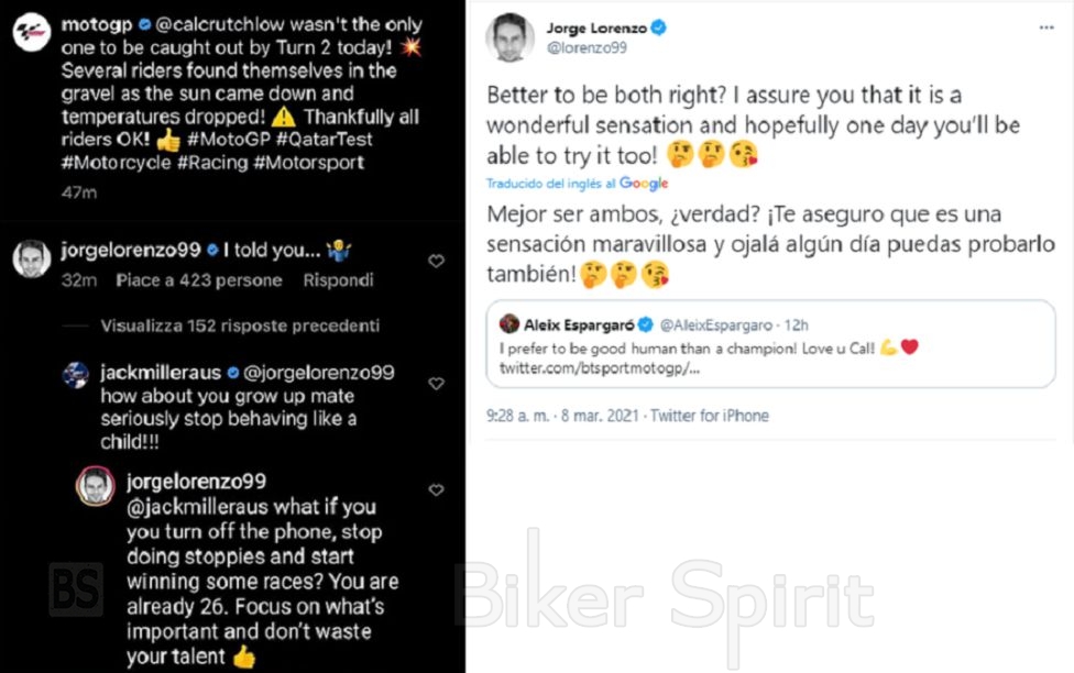 Ο Aleix Espargaró βλέποντας τη διαμάχη, σχολίασε στο Twitter «Θα προτιμούσα να είμαι καλός άνθρωπος παρά πρωταθλητής. Σ ‘αγαπώ, Cal» και αμέσως ο Lorenzo δεν έχασε χρόνο απατώντας με ειρωνικό σχόλιο: «Καλύτερα να είναι και τα δύο, σωστά; Σας διαβεβαιώνω ότι είναι ένα υπέροχο συναίσθημα και ελπίζω ότι μια μέρα μπορείτε να το δοκιμάσετε επίσης!»