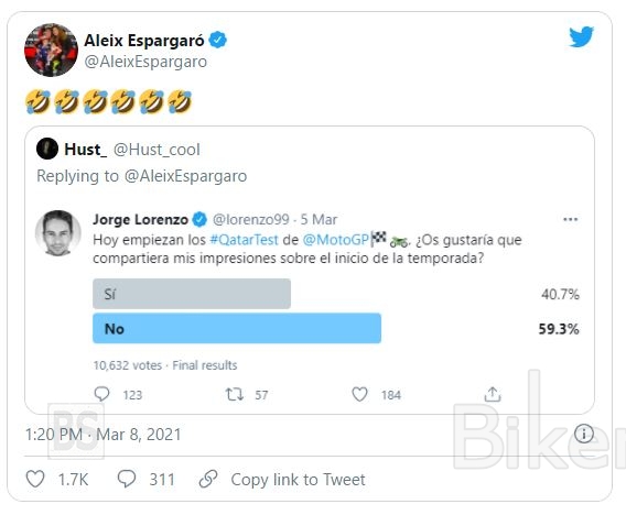 Ο Aleix Espargaro του απάντησε με το twitter της δημοσκόπησης που έκανε ο ίδιος ο Lorenzo που δεν μπόρεσε μάλλον να χωνέψει την απόρριψη που έφαγε από τους οπαδούς του σε μια δημοσκόπηση που έκανε ο Lorenzo , όπου ρώτησε τους οπαδούς του αν ήθελαν να μοιραστεί μαζί τους τις εντυπώσεις του για την έναρξη της σεζόν και το 60% ψήφισε όχι . Αυτό όπως φαίνεται εξόργισε τον Ισπανό, κάνοντας τον να προσβάλει χωρίς λόγο οδηγούς που μέχρι χθες ήταν στο ίδιο «paddock», και αν σκεφτεί κάνεις ότι ο Lorenzo θέλει να γινει σχολιαστής τηλεόρασης για τους αγώνες MotoGP, δεν νομίζουμε πως συμπεριφορά του θα βοηθήσει στην μελλοντική του ασχολία!